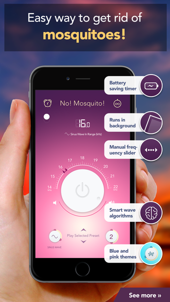 No Mosquito - Insect Repellent adalah aplikasi inovatif yang dirancang untuk mengusir nyamuk dengan menggunakan generator nada frekuensi. Aplikasi ini dilengkapi dengan pemilih frekuensi pintar dan fungsi suara otomatis yang dapat berjalan di latar belakang tanpa menguras baterai. Dengan algoritma generasi suara otomatis yang bekerja dalam rentang frekuensi 14 hingga 22 kHz, aplikasi ini memberikan kemudahan bagi pengguna untuk menjaga kenyamanan tidur tanpa gangguan dari nyamuk.